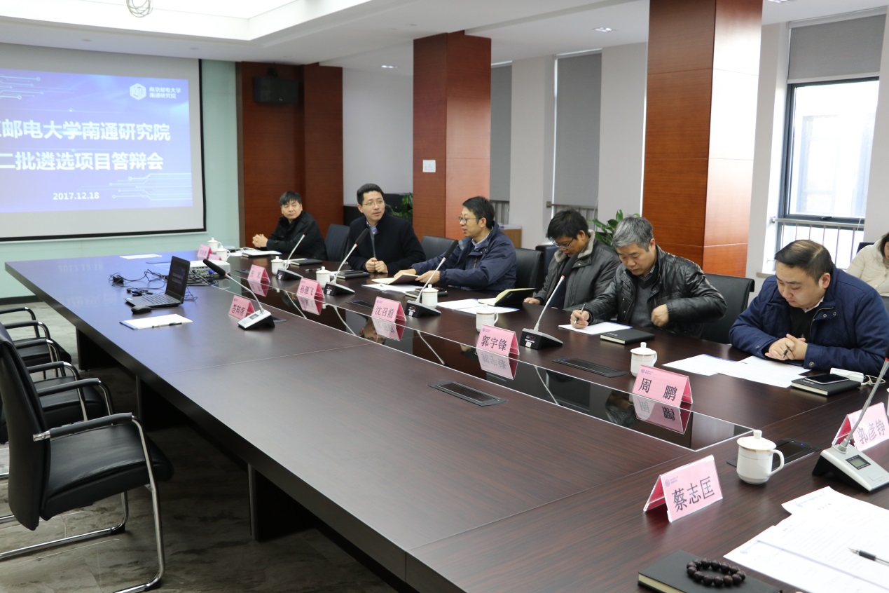 2017年12月18日,南京邮电大学南通研究院第二批遴选项目答辩会在我院三楼会议室召开。本次答辩评审委员会由南京邮电大学科研院常务副院长孙雁飞、南通市港闸区人民政府副区长张军、南京邮电大学国家大学科技园管理办公室主任沈召前、江苏省人才创新创业促进会专职秘书长李润豪、上海集成电路协会副会长王欣宇、南通国泰创业投资有限公司投资管理部副部长周鹏、南京邮电大学南通研究院院长郭宇锋等七位专家组成。孙雁飞教授担任本次评委会组长,郭宇锋教授主持会议。